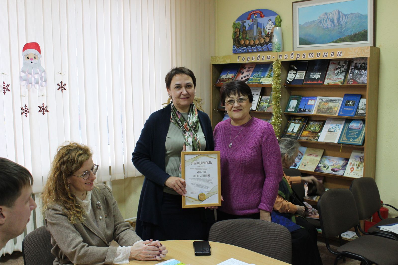 В конце встречи борисовские поэты представили поздравительный поэтический экспромт «Новогодние мотивы». Помимо того, заместитель председателя Борисовской областной организации ОО «Белорусское общество инвалидов» Татьяна Алехнович вручила директору библиотеки Колодеева Благодарность председателя Правления Борисовской ОО ОО «БелОИ».