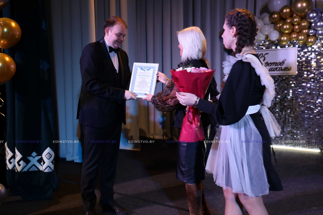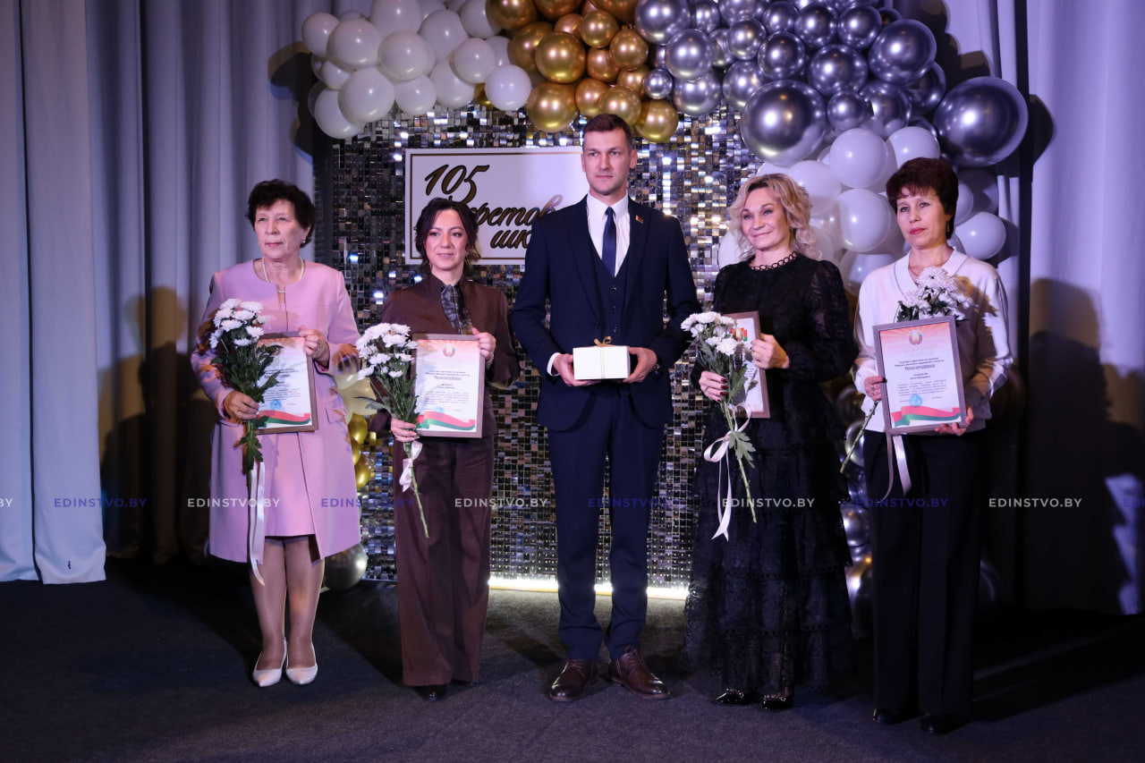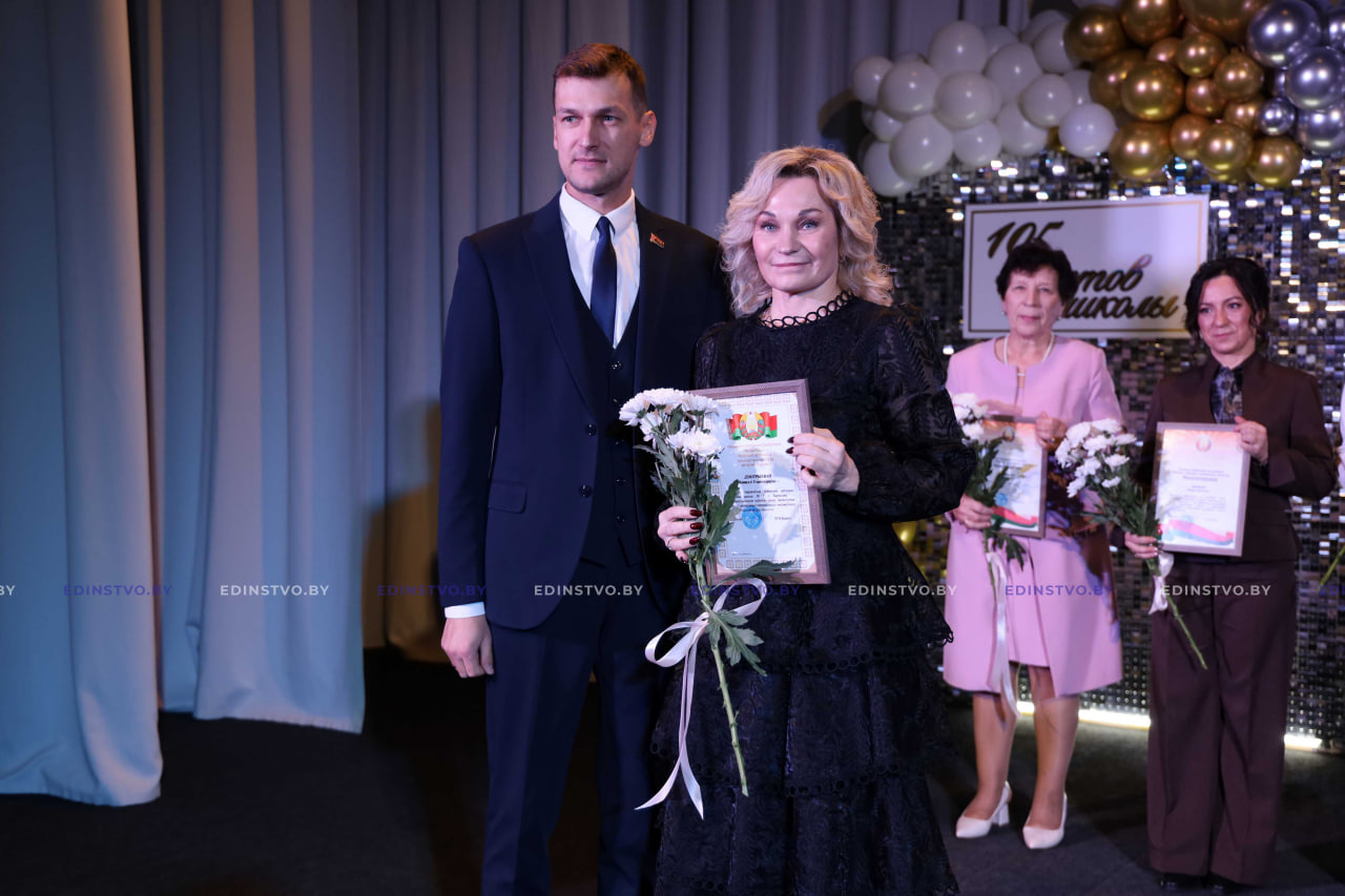 Она вручила Почетную грамоту Борисовского районного Совета депутатов директору школы Наталье Дмитриевой, Благодарности Борисовского районного Совета депутатов за активную гражданскую позицию, многолетний добросовестный труд в системе образования, достигнутые успехи в обучении и воспитании подрастающего поколения и в связи со 105-летним юбилеем школы заместителю директора по учебной работе Виолетте Чернышевой, учителям русского языка и литературы Галине Валуевой и Оксане Шеверновской.