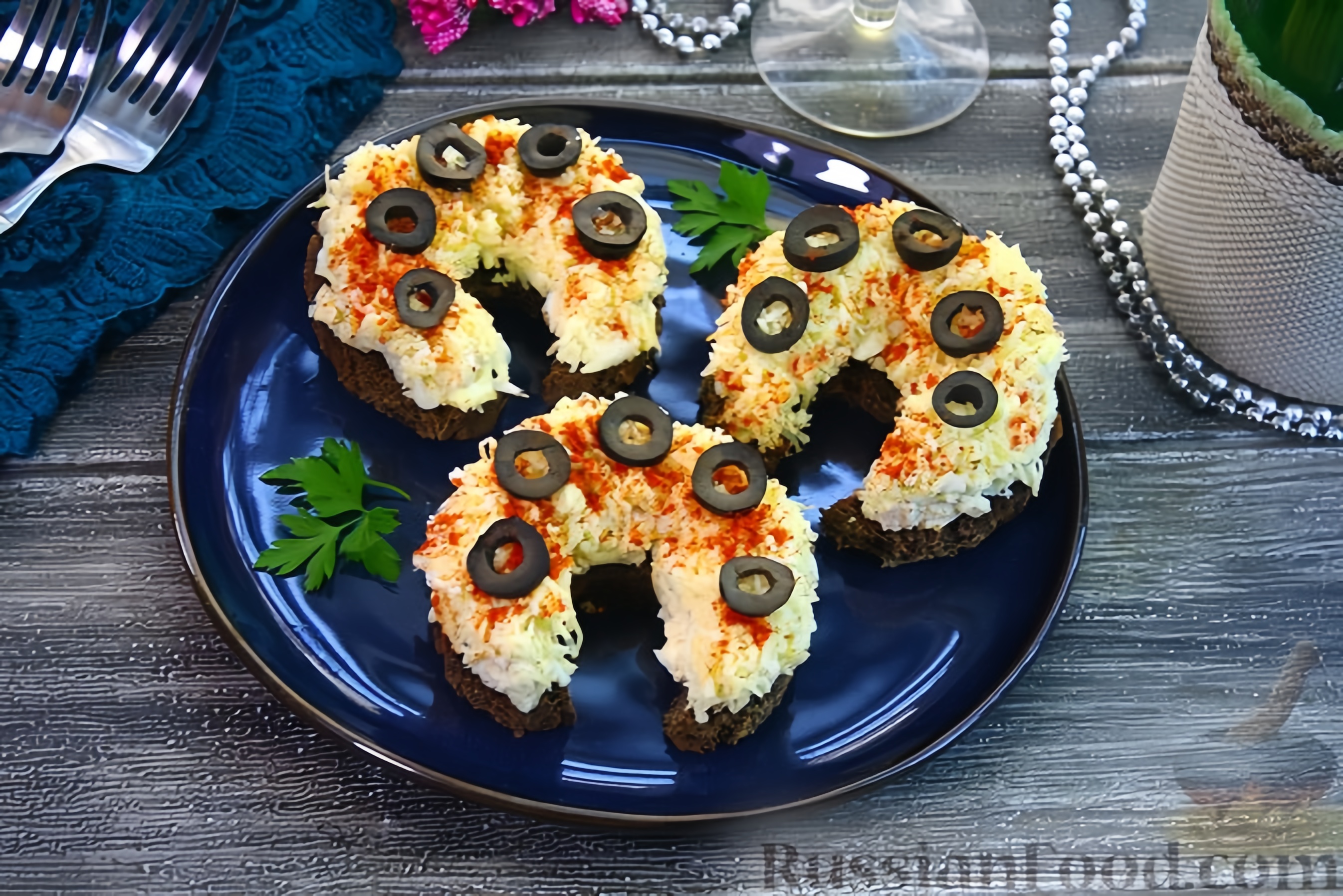 Куриное филе и яйца предварительно отвариваем. Подходящей круглой формочкой или чашкой вырезаем из ломтиков хлеба круги, затем ножом вырезаем в серединке мякиш, чтобы получилась подкова. Хлеб подсушиваем на сухой сковороде. Куриное филе мелко нарезаем, натираем яйца на терке, добавляем чеснок, соль, перец, майонез и все соединяем вместе. Выкладываем начинку на хлеб, посыпаем мелко натертым сыром. Сверху подковы посыпаем паприкой и украшаем тонко нарезанными кольцами маслин.