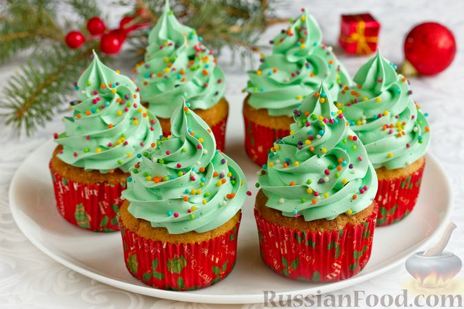 Размягченное сливочное масло смешайте с сахаром и ванилином, взбейте миксером. Добавьте яйцо и снова перемешайте. В получившуюся основу влейте молоко комнатной температуры, взбивайте массу до однородности. Муку смешайте с разрыхлителем и просейте в миску с яично-масляной основой, перемешайте. Разлейте тесто в формы для кексов, выпекайте в предварительно разогретой до 180 градусов духовке 25-30 минут. Яйца разделите на белки и желтки. Желтки нам не понадобятся, а вот белки перелейте в миску. К белкам всыпьте сахар и щепотку лимонной кислоты. Миксером на высокой скорости взбейте белки с сахаром и лимонной кислотой 30 секунд, до пены. В кастрюлю налейте кипяток, примерно 300 мл. Сверху на кастрюлю поставьте миску с белково-сахарной пеной (дно миски не должно касаться воды). Поставьте кастрюлю на средний огонь и миксером на средних оборотах взбивайте белки с сахаром на протяжении 10 минут. Затем миску с кремом снимите с кастрюли и взбивайте крем еще 5 минут. Добавьте в крем зеленый пищевой краситель и отсадите на кексы в виде елочек, посыпьте капкейки разноцветной кондитерской посыпкой.