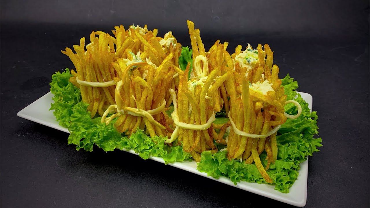 Картофель очистите, нарежьте соломкой, либо возьмите замороженную заготовку для картофеля-фри. Обжарьте в масле до румяности. Огурец натрите длинной соломкой, отварное куриное филе разделите на волокна, плавленый сыр натрите на терке, добавьте чеснок, майонез и соедините все ингредиенты. Добавьте соль и перец в начинку по вкусу. На рабочую поверхность в одну линию разложите картофельную соломку, на один край выложите примерно ложку начинки. Аккуратно сверните соломки в плотный рулетик и перевяжите рулетик тонкой «ниткой» из сырной косички. Повторите так со всеми порциями.