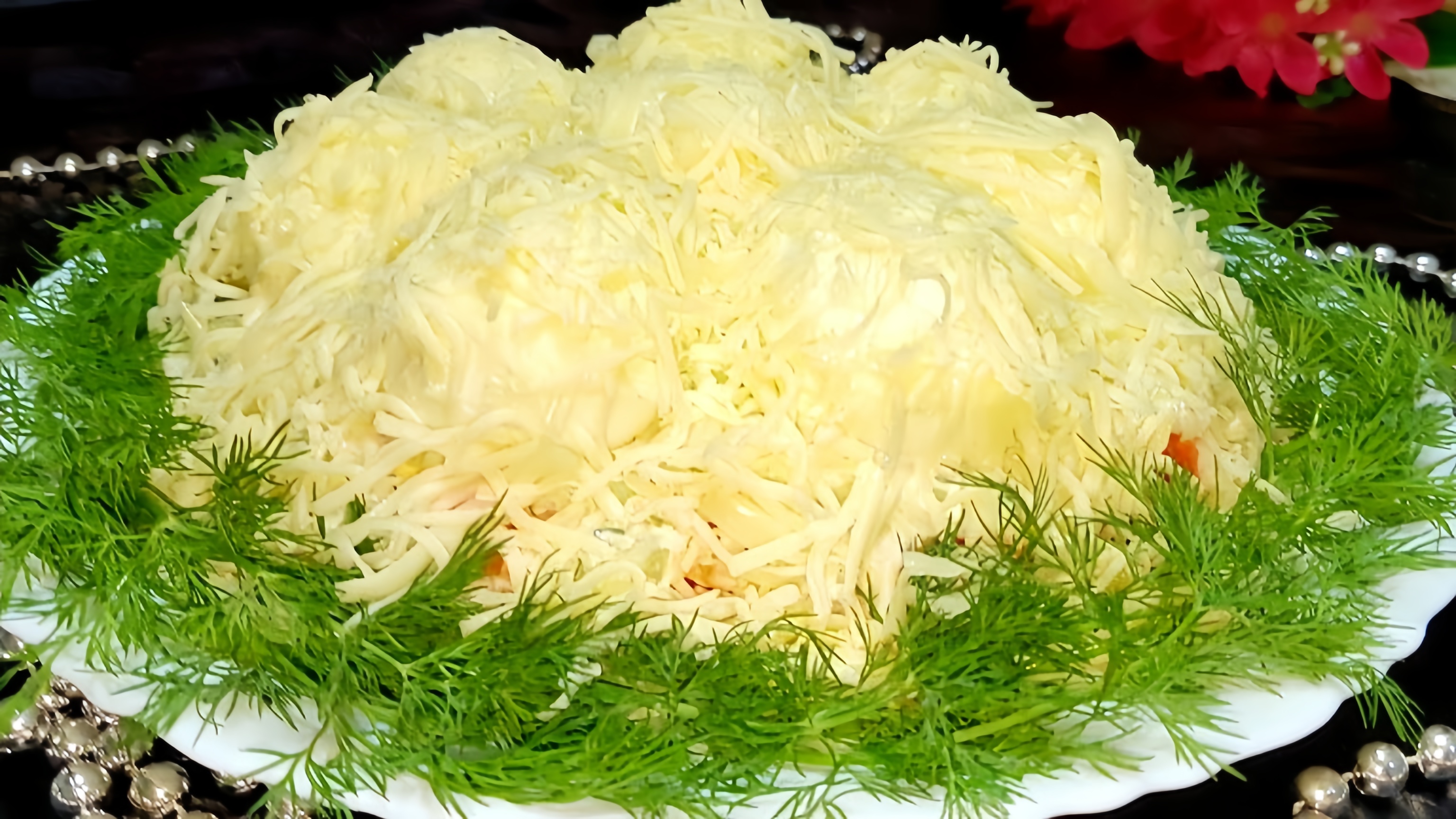 Куриное филе, яйца и морковь отвариваем до готовности. Лук очищаем и нарезаем мелкими кубиками, добавляем сахар, соль, уксус, заливаем кипятком и перемешиваем. Накрываем емкость и оставляем мариноваться на 15-20 минут. Куриное филе разбираем на волокна или мелко нарезаем, яйца очищаем и каждое разрезаем пополам, вынимаем желтки. Чеснок очищаем, пропускаем через пресс и соединяем с яичными желтками. Добавляем 40 г майонеза, соль и черный молотый перец. Растираем желтки вилкой до однородности, наполняем этой смесью белки. Очищенную и натертую на терке морковь выкладываем первым слоем на круглое блюдо, солим по вкусу и наносим майонезную сетку. Следующим слоем выкладываем куриное филе, затем лук, каждый слой промазываем майонезом. Сверху выкладываем фаршированные яйца начинкой вниз, обильно посыпаем салат натертым сыром.