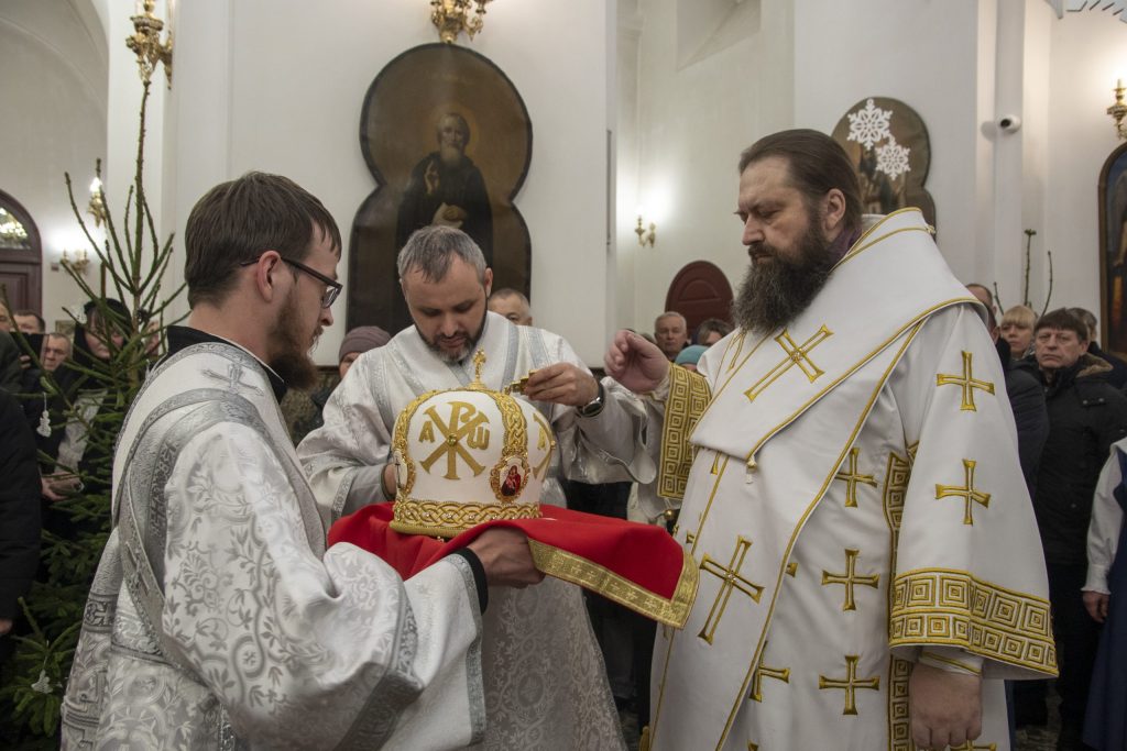 В свою очередь ключарь собора протоиерей Павел Яцукович поздравил епископа Амвросия с праздником Рождества Христова и от лица духовенства, мирян собора преподнёс владыке митру.
