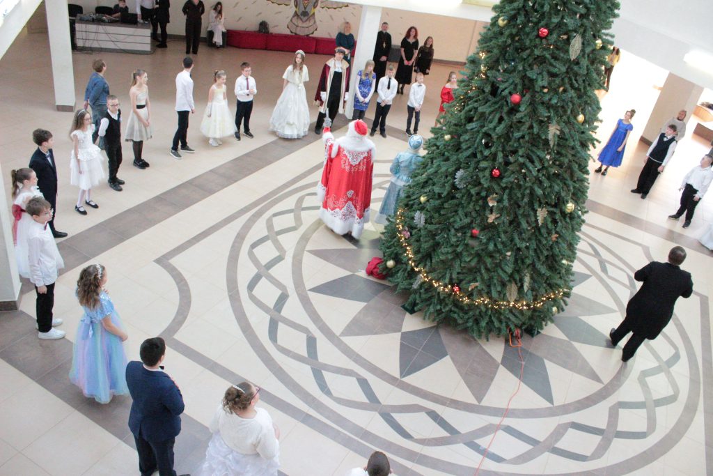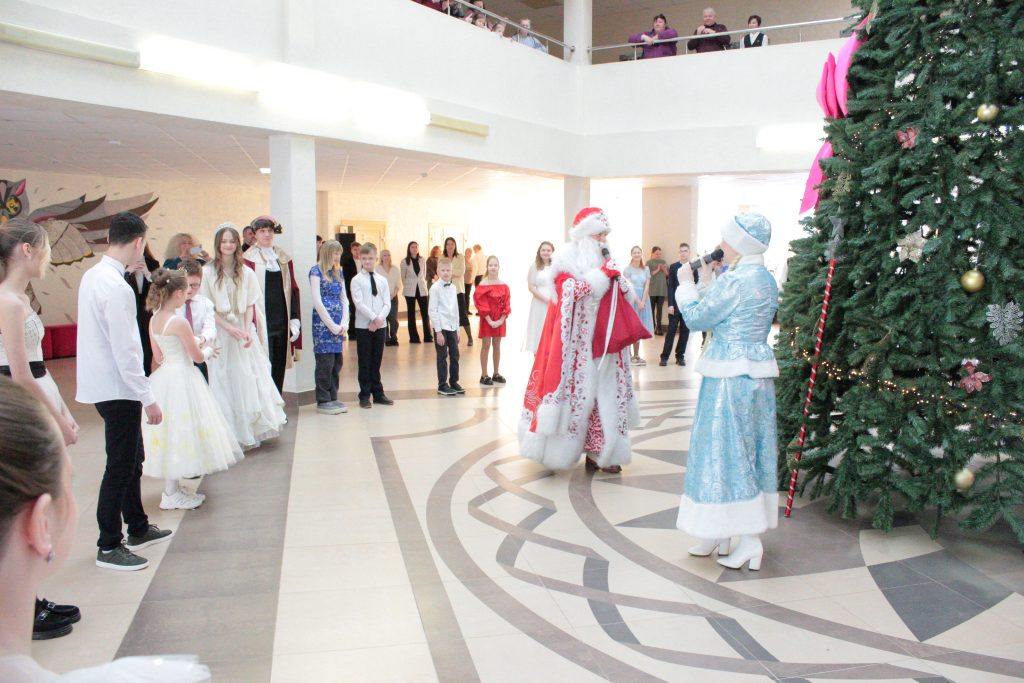 Праздник проходил в веселой атмосфере: Дед Мороз и Снегурочка поздравляли ребят с Новым годом и Рождеством, устраивали конкурсы и дарили подарки. И, конечно же, как и на всяком балу, участников ожидал торжественный танец. В завершение праздника дети смогли сфотографироваться на фоне елки вместе со сказочными персонажами.