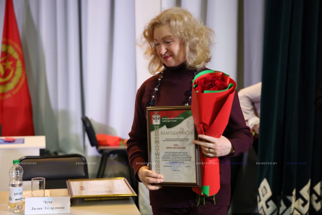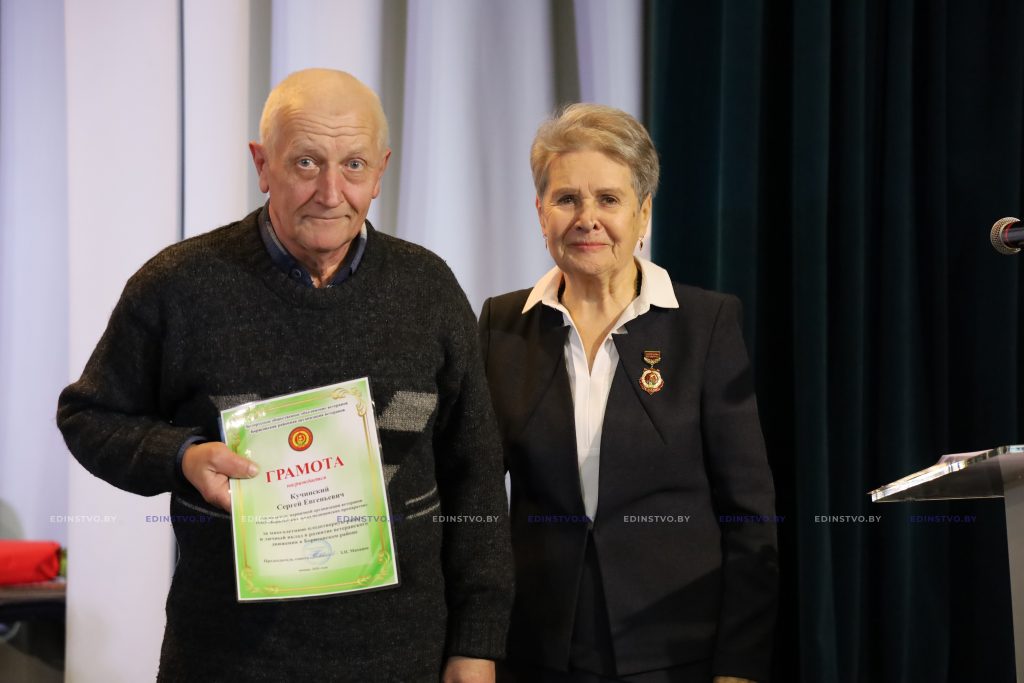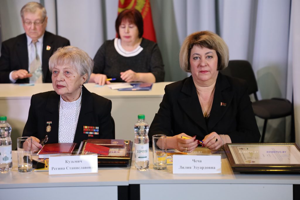 Заместитель председателя совета Минской областной организации ветеранов Регина Кузьмич поблагодарила Борисовскую районную организацию ветеранов и всех ее членов за достойный труд и активную деятельность, а также вручила заместителю председателя Борисовского районного совета ветеранов Анне Буевич нагрудный знак Белорусского общественного объединения ветеранов «За заслуги». Знака «Почетный ветеран» Белорусского общественного объединения ветеранов удостоены Тамара Холина и Николай Мешков.