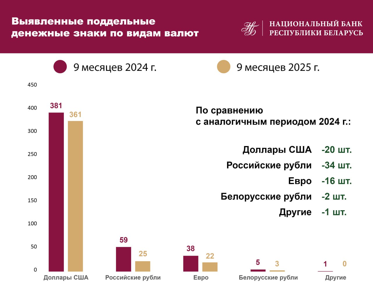 По сравнению с январем-сентябрем 2024 года количество выявленных фальшивок номиналом: