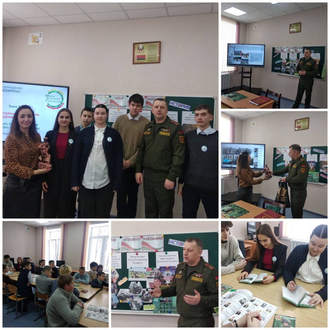 Перед учащимися выступил помощник начальника Департамента по идеологической работе — начальник группы Департамента транспортного обеспечения Министерства обороны Янушкевич Валерий Иванович. Он рассказал о структуре Вооруженных Сил Республики Беларусь, о возможностях получения военного образования в ВУЗах нашей страны. Также Валерий Иванович ответил на вопросы ребят о повседневной службе, перспективах карьерного роста в армии и роли граждан в обеспечении безопасности страны. Ответы вдохновили многих на активное участие в патриотическом воспитании и самообразовании.