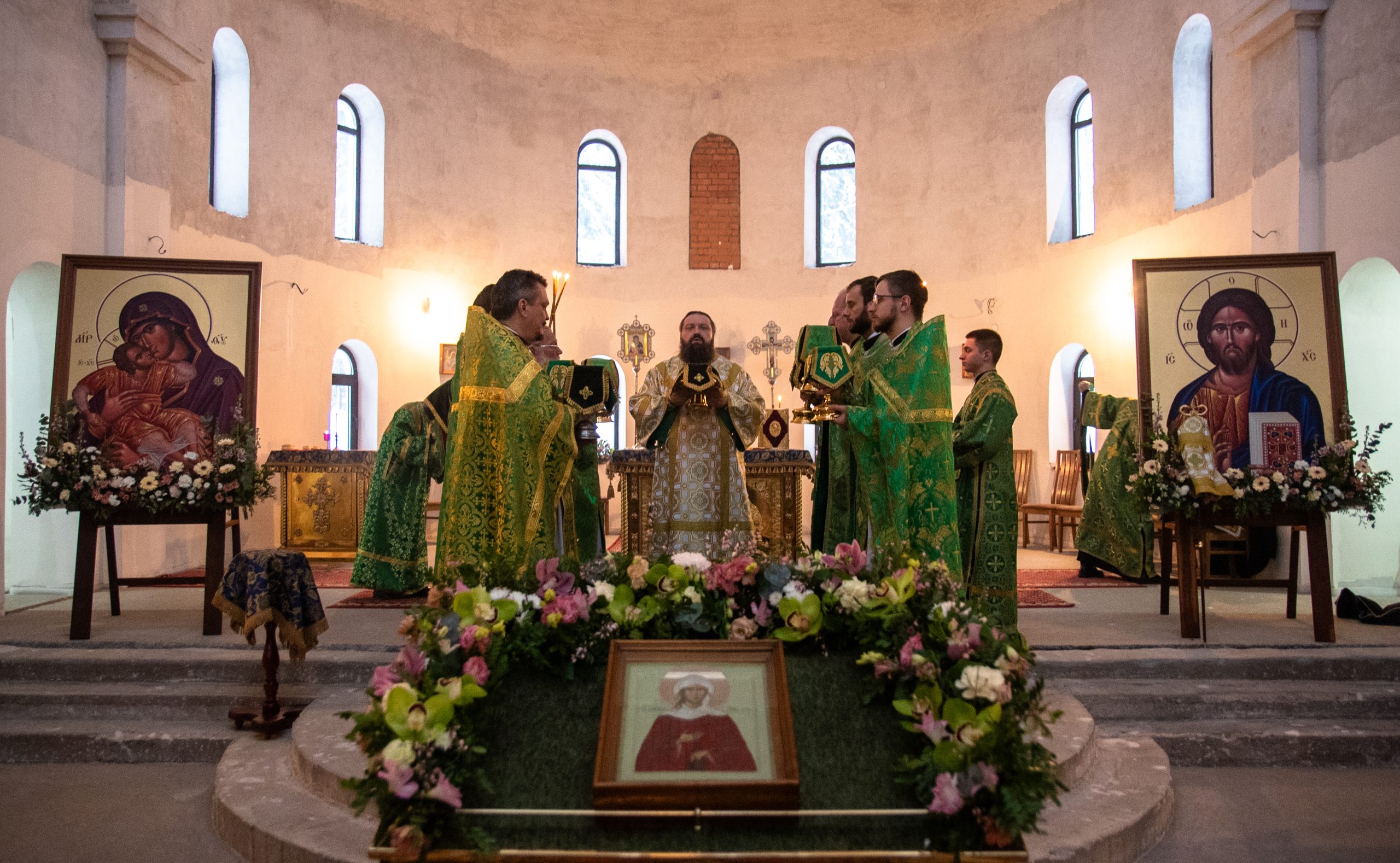 По окончании богослужения архиерей и духовенство совершили славление святой блаженной Ксении Петербургской, после чего владыка обратился к духовенству, сестрам обители и паломникам с архипастырским словом.