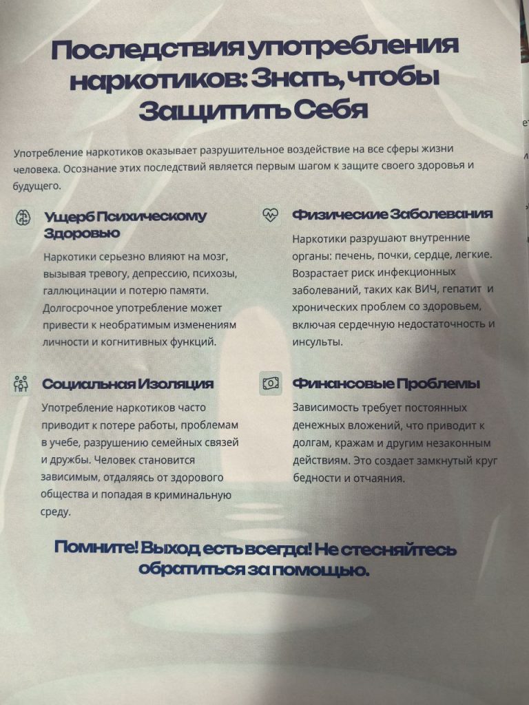 Участникам встречи напомнили ещё раз о вреде вейпов, психоактивных веществ, об ответственности за совершение преступлений по линии незаконного оборота наркотиков. Видеоролик и наглядная агитация, которые получили учащиеся во время беседы, будут содействовать недопущению вовлечения в наркопреступления несовершеннолетних.