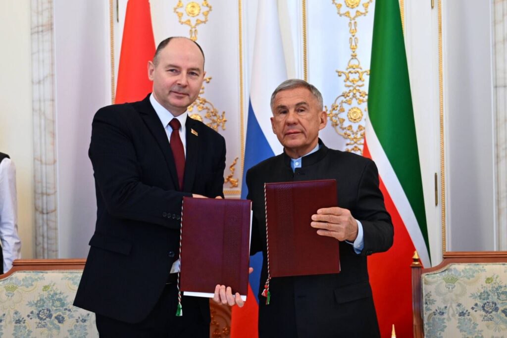 Свои подписи под документом поставили председатель Миноблисполкома Алексей Кушнаренко и Раис Республики Татарстан Рустам Минниханов во время приема в казанском Кремле.