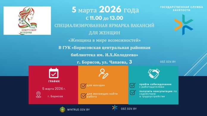 В Борисове специализированная ярмарка вакансий пройдет 5 марта 2026 года с 11:00 до 13:00 в ГУК «Борисовская центральная районная библиотека имени И.Х.Колодеева» на ул. Чапаева, 3.
