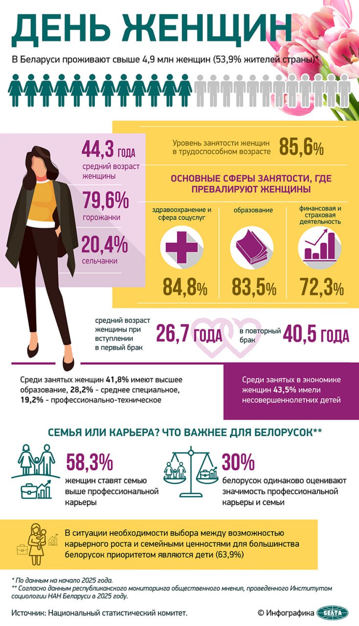 По данным на начало 2025 года в Беларуси проживает свыше 4,9 млн женщин, что составляет 53,9% от общего числа жителей страны.