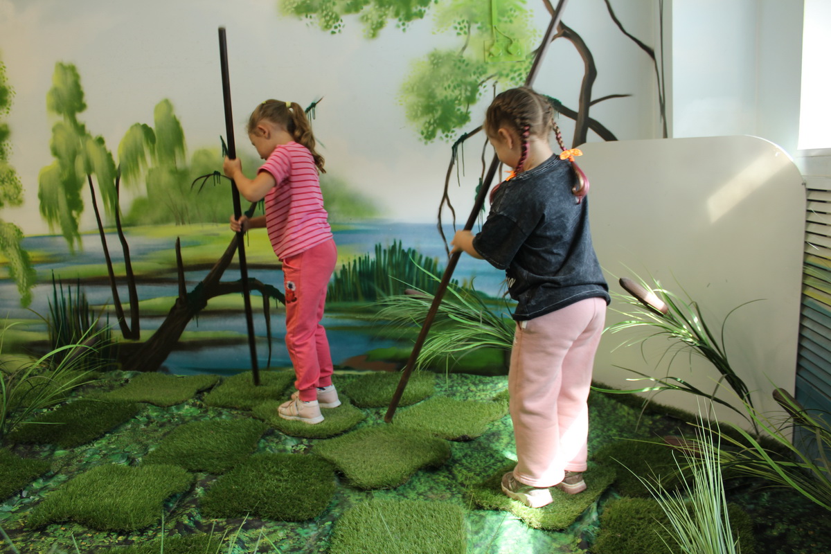В программе дня было два сложных, но увлекательных испытания: «Болото» и «Эвакуация». Первым испытанием для отважной группы стала полоса препятствий, имитирующая лесное болото. Работники Центра превратили безопасный зал в настоящую топь с кочками. Малышам объяснили: наступать можно только на твердые места, нельзя паниковать и шуметь, чтобы не провалиться в трясину.