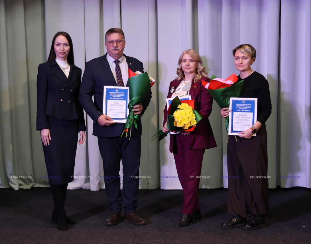 За активную гражданскую позицию, укрепление белорусских ценностей, инициативность, ответственность, личный вклад в формирование положительного имиджа Борисовской районной организации Республиканского общественного объединения «Белая Русь» Благодарность Совета Борисовской районной организации Республиканского общественного объединения «Белая Русь» вручена заместителю директора по правовой и идеологической работе открытого акционерного общества «Веста-Борисов» Алле Минченко, генеральному директору образовательно-продюсерского центра «Голоса» Егору Канну, старшему научному сотруднику государственного учреждения «Борисовский объединенный музей» Елене Шиловой.