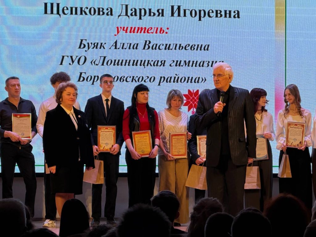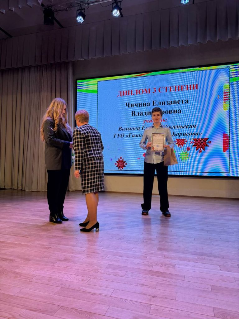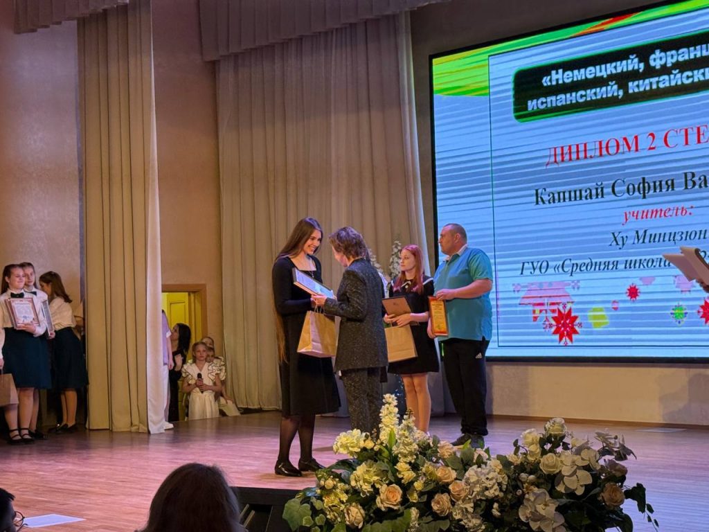 Начальник управления по образованию Борисовского райисполкома Ирина Садовская поздравила и вручила благодарности победителям третьего этапа республиканской олимпиады по учебным предметам «Белорусский язык» и «Белорусская литература» Виктории Волковец (гимназия № 3), Софье Станкевич (гимназия №3), Елизавете Гаврилович (белорусскоязычная гимназия №2), Евгении Куде (белорусскоязычная гимназия №2), Любови Корневой (белорусскоязычная гимназия №2), Валерии Шинкевич (СШ №10), по учебным предметам «Русский язык» и «Русская литература» Полине Пасиковой (гимназия №1), Аделине Серафимович (Лошницкая гимназия), Владиславе Минич (гимназия № 3), Диане Бирюковой (СШ № 13), Полине Павлинич (гимназия № 3), Ульяне Павловец (СШ № 23), по учебному предмету «Английский язык» Тубайесу Кранкову-Моксаму (СШ № 16), Ивану Щуроку (СШ № 18), Анне Серчени (гимназия № 3), по учебному предмету «Немецкий язык» Максиму Алисионок (СШ № 2), Дмитрию Хоффманну (СШ № 10), по учебному предмету «Испанский язык» Ярославу Сурме (СШ № 17), Алексею Дородейко (СШ № 17), Софии Филончик (СШ № 17), Ульяне Ржеутской (СШ № 17), Анастасии Заплаве (СШ № 17), по учебному предмету «Китайский язык» Маргарите Хомичёнок (СШ № 12).