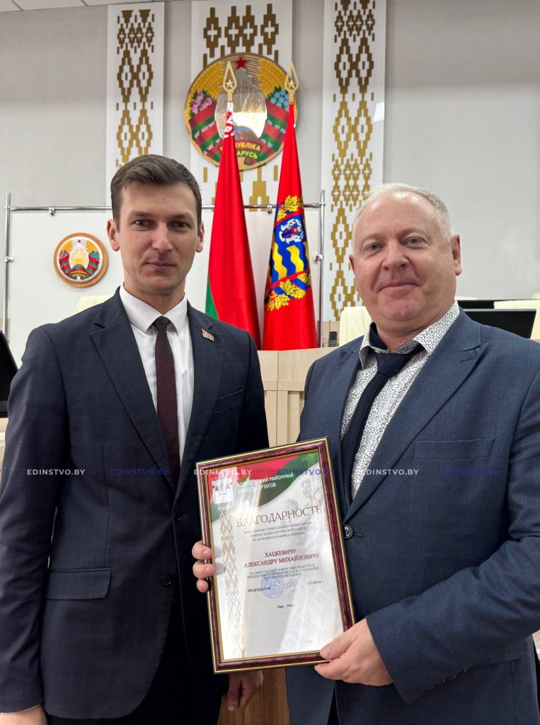 В рамках совещания Благодарность районного Совета депутатов вручена заместителю генерального директора по идеологической работе УП «Бумажная фабрика» Гознака Александру Хацкевичу за многолетний добросовестный труд, инициативу и личный вклад в сохранение исторической памяти.