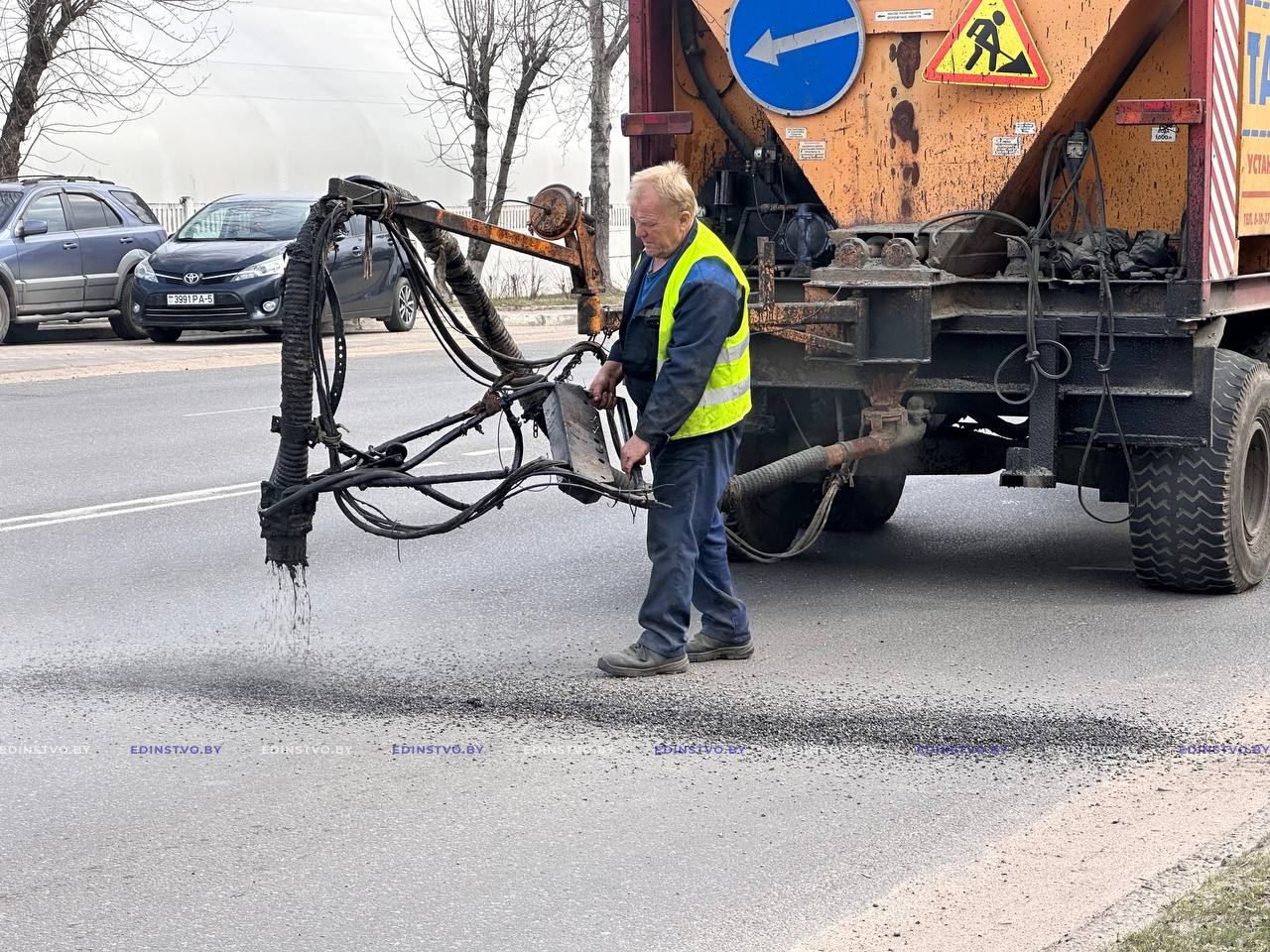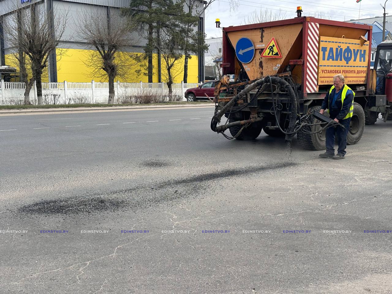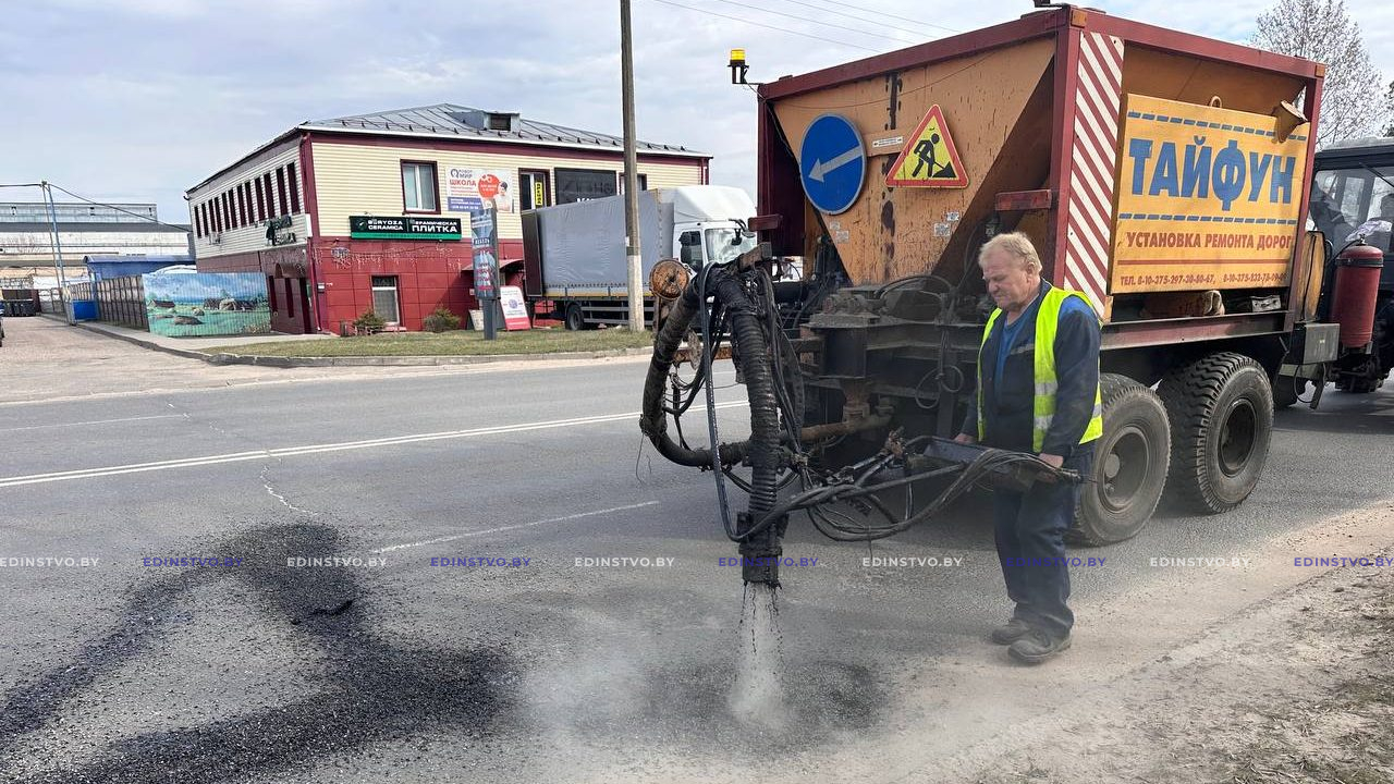 Сегодня на участке проезжей части ул. Строителей от ее пересечения с ул. Гагарина до перекрестка с ул. Чапаева начался ремонт дорожного покрытия с применением современной специальной техники – УРД «Тайфун» УП «Жилье». Машина за один проход очищает поверхность, заделывает трещины и ямы, возвращая асфальту ровность и обеспечивая долговечность.