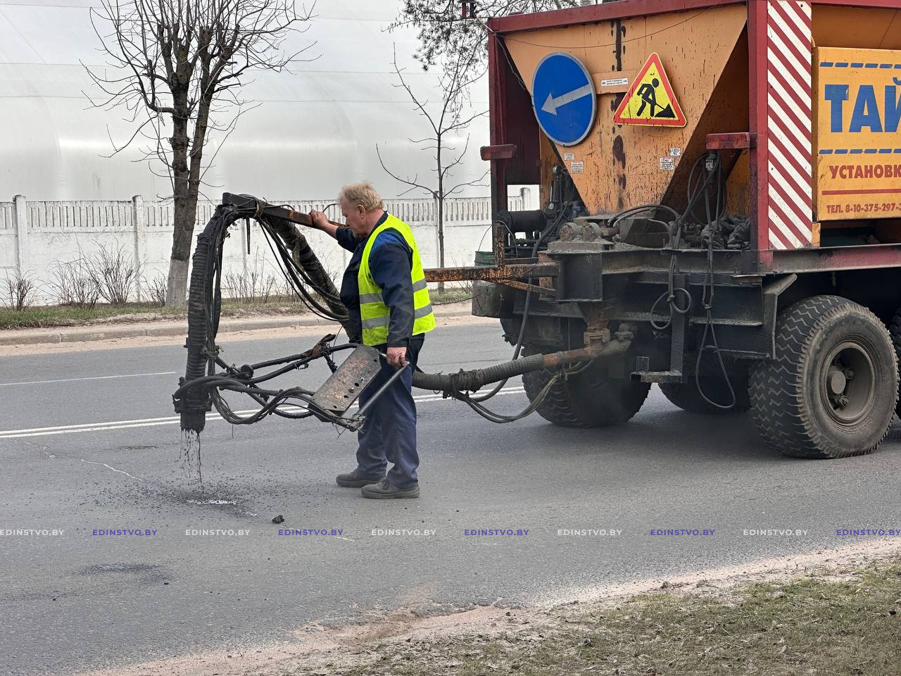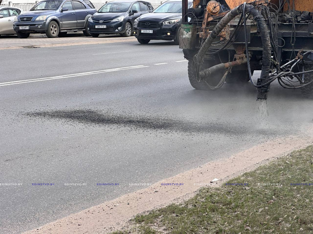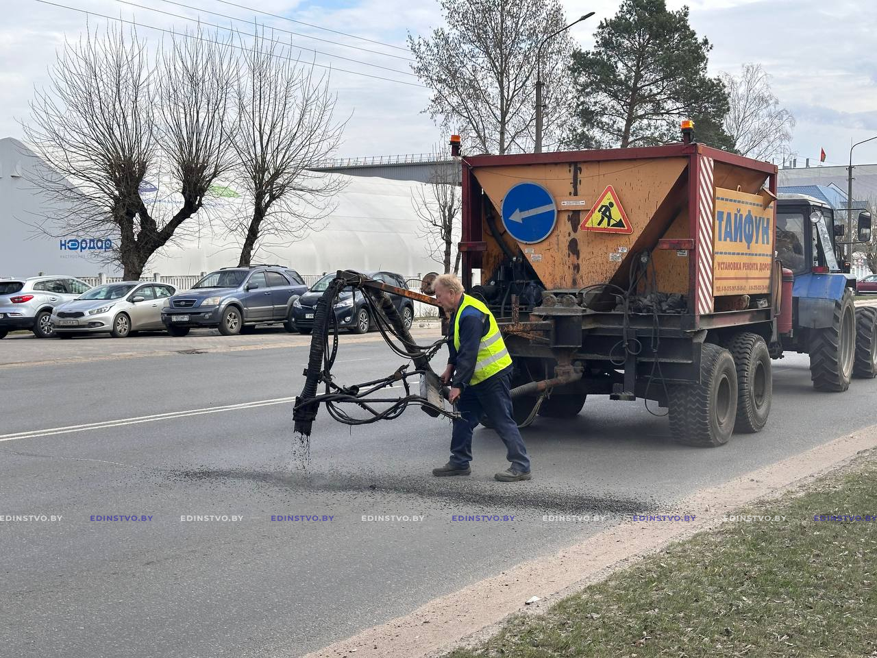 Сегодня на участке проезжей части ул. Строителей от ее пересечения с ул. Гагарина до перекрестка с ул. Чапаева начался ремонт дорожного покрытия с применением современной специальной техники – УРД «Тайфун» УП «Жилье». Машина за один проход очищает поверхность, заделывает трещины и ямы, возвращая асфальту ровность и обеспечивая долговечность.