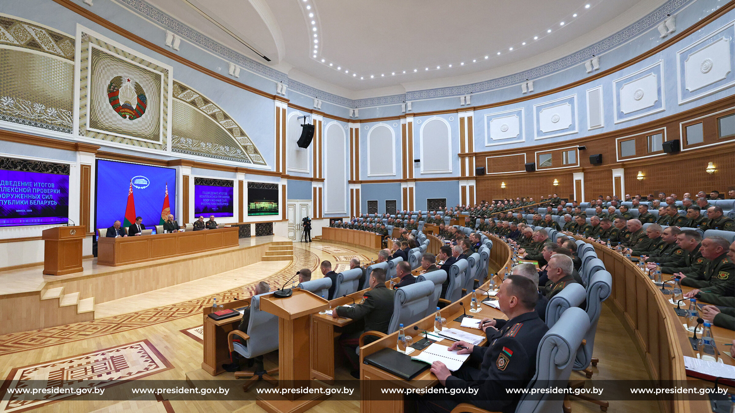 Обращаясь к участникам совещания, белорусский лидер отметил, что масштабная проверка Вооруженных Сил проводилась как никогда масштабно и жестко и достаточно активно освещалась в СМИ. «Мы ставили участников в условия, максимально приближенные к реальным вызовам, без скидок на погоду, время суток и прочие факторы», — заявил он.