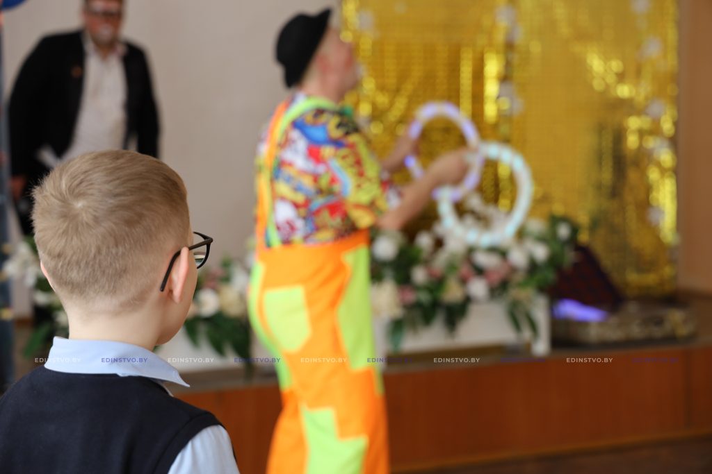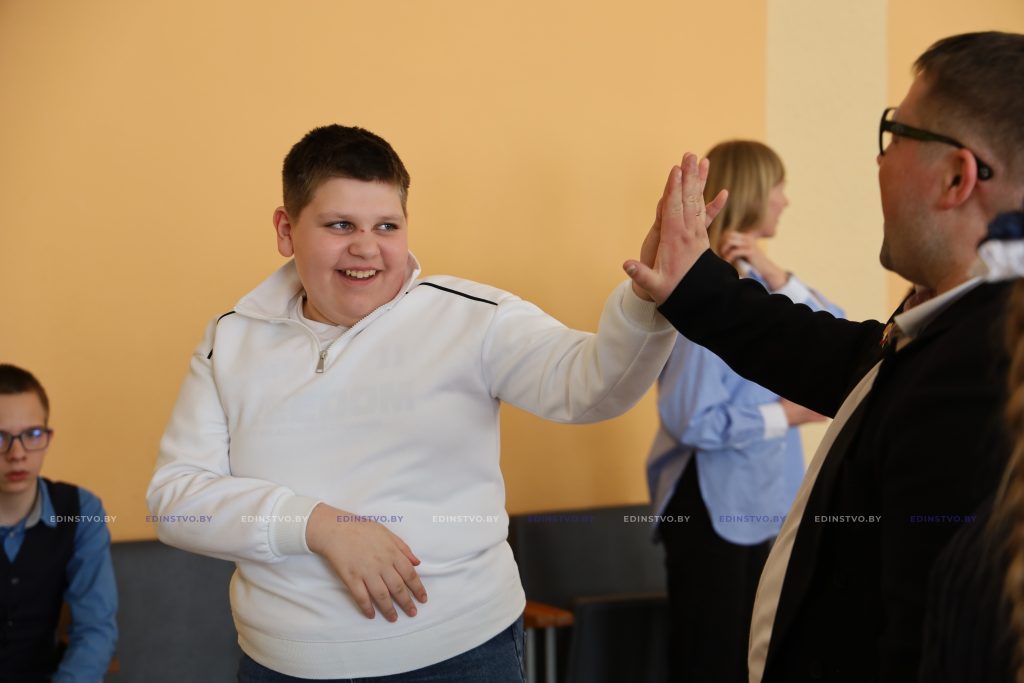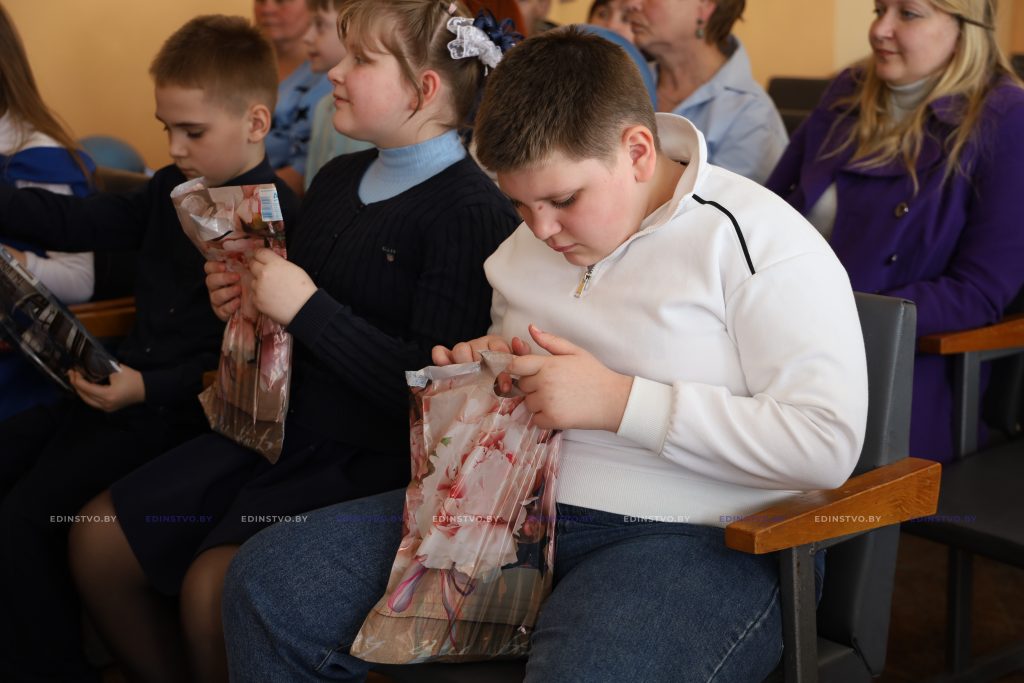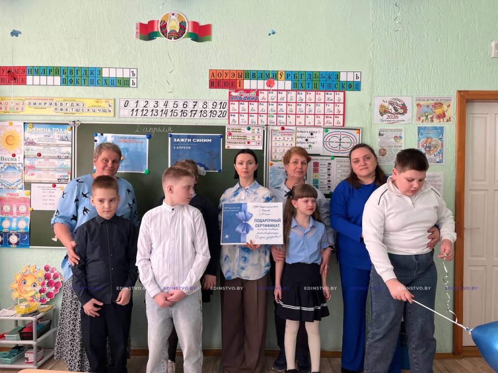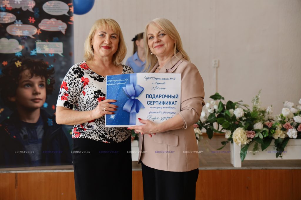 В этот значимый день школу также посетили почетные гости. Специалист по идеологической работе Борисовского завода медицинских препаратов Мария Синькевич предприятия обратилась к ребятам с теплыми словами, пожелала им здоровья, счастья и уверенности в себе. В завершение встречи она передала директору школы денежный сертификат на приобретение телевизора, фитболов и флипчарта для специального класса учреждения.