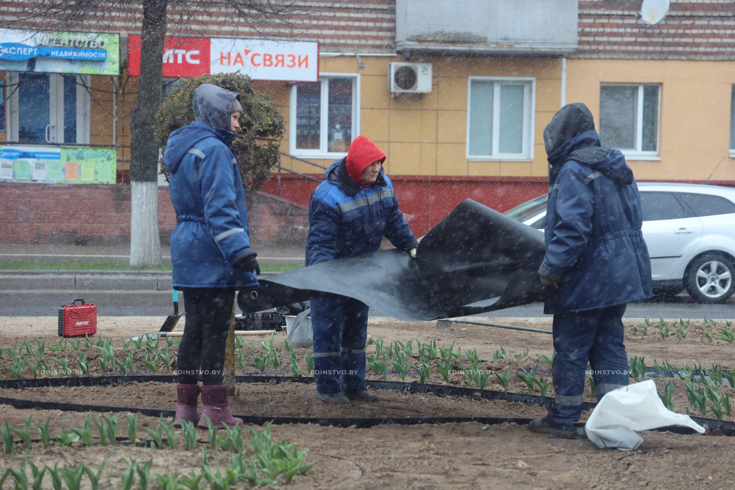 Снег в апреле — явление временное, а работа по благоустройству города продолжается в плановом режиме.