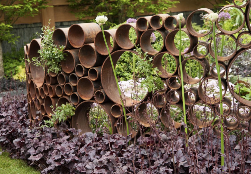 Металл в саду – это не обязательно массивные конструкции. Сейчас в тренде тонкие металлические силуэты: декоративные фигуры птиц, листьев, садовые панели с ажурной резьбой. Они смотрятся изящно, особенно на фоне зелени.