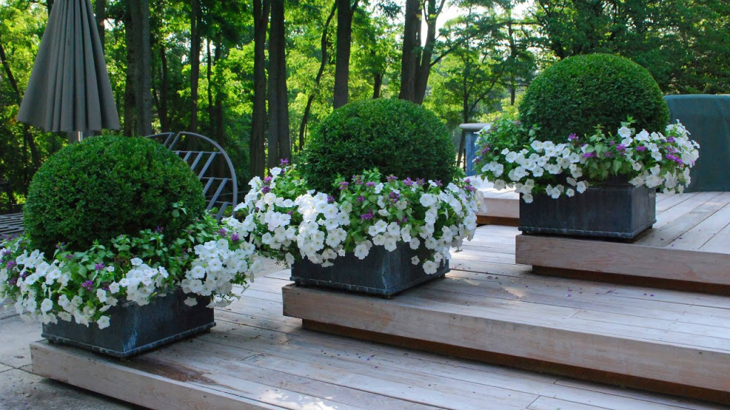 Вместо стандартных клумб можно создать мобильные цветочные композиции в крупных минималистичных кашпо. Хорошо смотрятся однотипные контейнеры, выставленные группой у входа в дом или на террасе.