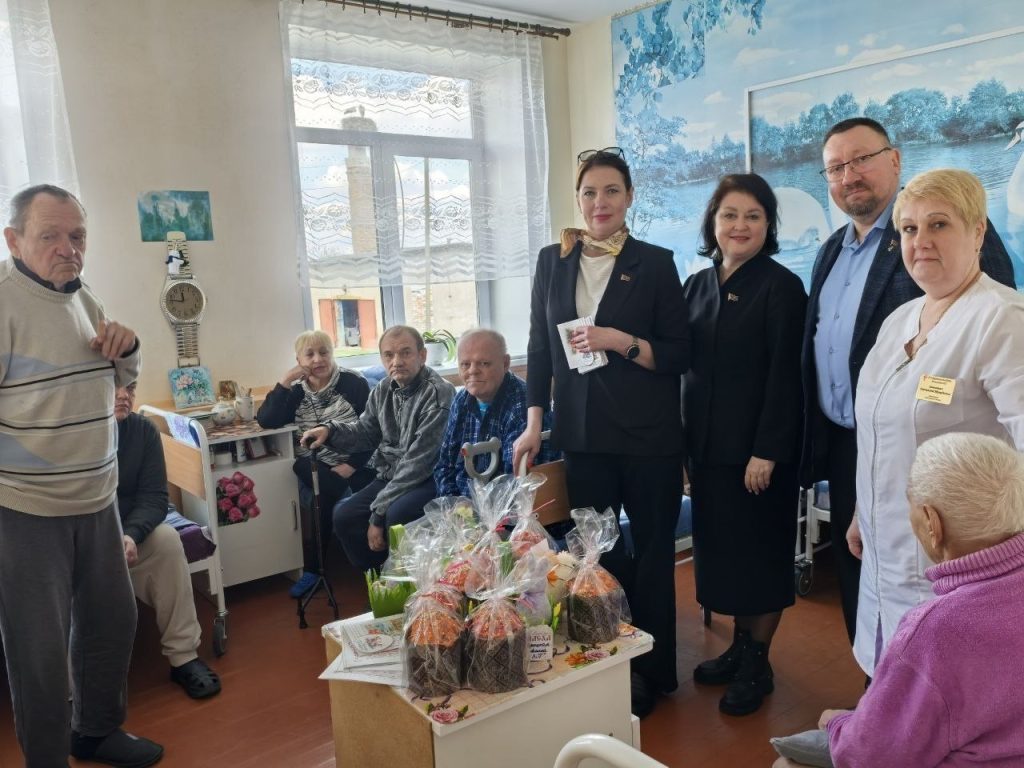 В рамках благотворительной акции «Подари радость ближнему» первый заместитель председателя Борисовского райисполкома Николай Швайбович, начальник отдела идеологической работы и по делам молодежи райисполкома, председатель Борисовской районной организации ОО «Белорусский фонд мира» Татьяна Чуйкова, начальник отдела торговли и услуг Борисовского райисполкома, председатель первичной организации РОО «Белорусское Общество Красного Креста» райисполкома Ольга Мяделец, настоятель храма святого Архангела Михаила аг. Лошница иерей Александр Лукьянович посетили отделение круглосуточного пребывания для граждан пожилого возраста и инвалидов в аг. Забашевичи, чтобы поздравить постояльцев со светлым праздником Пасхи.