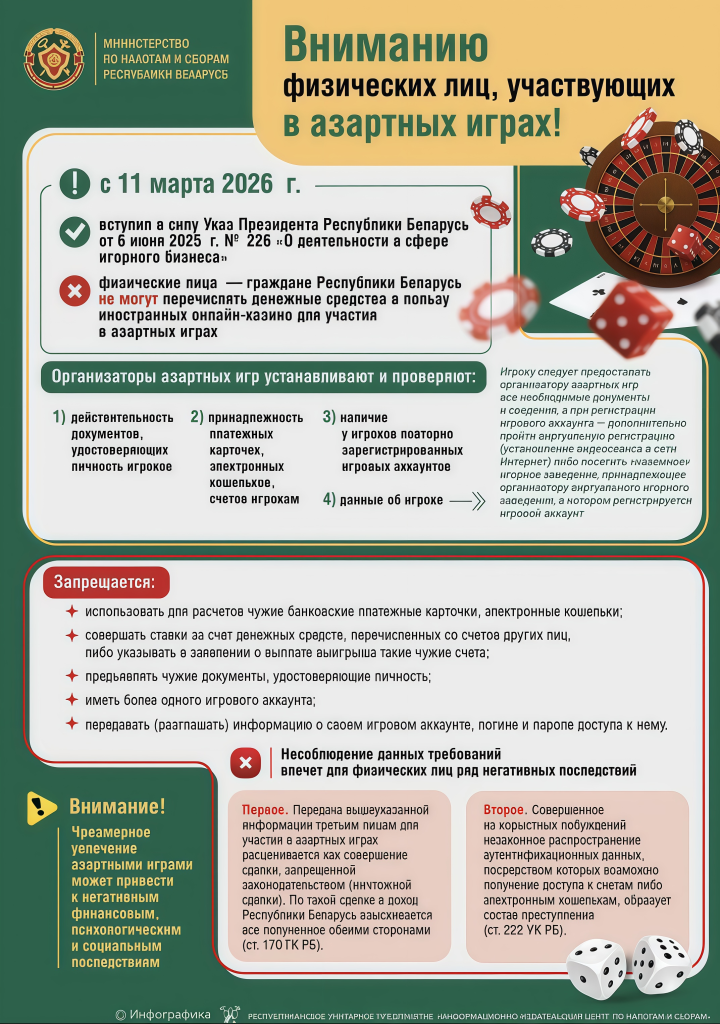 Что нужно знать физическим лицам, участвующим в азартных играхЧ 19.04.2026 2 Общество АдзiнстваОбществоЧто нужно знать физическим лицам, участвующим в азартных играх 18,911ЧитателиЧитать54,100ЧитателиЧитать933ПодписчикиПодписаться Популярное За 7 днейВсеРекомендуемыеСамые просматриваемыеПодробнее Как изменится пятиэтажка на улице Люси Чаловской в Борисове Своими руками и без лишних затрат: небанальные идеи декора... Сезон открыт: 6 лучших рецептов маринадов для шашлыка Жительница Борисова под предлогом декларирования денег перевела мошенникам более... 65-летие со дня образования отметила стоматологическая поликлиника Борисовской ЦРБ Дорожные работы и озеленение: благоустройство в Борисове продолжается Напоминаем, где и когда в Борисове пройдут весенние ярмарки «Чистый четверг» объединил борисовчан на уборке центрального городского пляжа Инспекция Министерства по налогам и сборам Республики Беларусь по Борисовскому району Похожие материалы МеткиМНС Поделиться FacebookXPinterestWhatsAppEmailРаспечататьTelegramVKViberCopy URL АдзiнстваОбществоЧто нужно знать физическим лицам, участвующим в азартных играх Предыдущая новостьДелимся рецептом ароматных маффинов с тыквойСледующая новостьВладислав Вощук посвятил службе в Вооруженных Силах Республики Беларусь 30 лет Подписаться на наши социальные сети TelegramTelegramInstagramInstagramTiktokTiktokYoutubeYoutubeVkVkFacebookFacebookOKOK Последние новости Владислав Вощук посвятил службе в Вооруженных Силах Республики Беларусь... 19.04.2026 Делимся рецептом ароматных маффинов с тыквой 19.04.2026 В Беларуси будут штрафовать за плохое качество услуг сотовой... 19.04.2026 Как в Борисове завтра будут дежурить врачи 19.04.2026 Инвестиционные программы на контроле: по требованию прокуратуры Гомеля изменена... 19.04.2026 Гоночная трасса определит лучших. На Борисовщине проходит первый этап... 19.04.2026 Сотрудники милиции Минщины обеспечат охрану общественного порядка в период... 19.04.2026 Дворы каких домов на ул. Серебренникова в Борисове будут... 19.04.2026