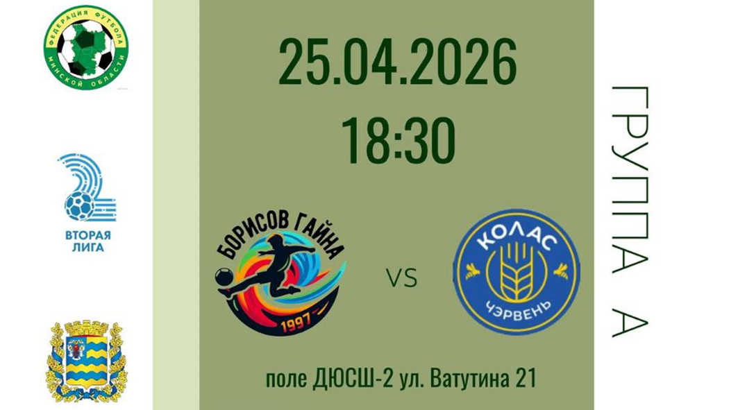 «Борисов-Гайна 1997», попавший в пульку с индексом «А», в субботу, 25 апреля, встретится в родных стенах с грозным «Колосом» из Червеня. Поединок пройдет на стадионе ДЮСШ-2 по ул. Ватутина, 21 и начнется 18.30. Приглашаем любителей спорта посетить интересную игру!