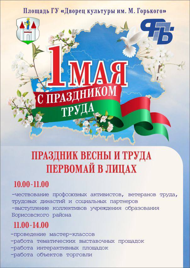 С 10:00 до 11:00 состоится церемония чествования профсоюзных активистов, ветеранов труда, трудовых династий и социальных партнеров. Для гостей праздника выступят коллективы учреждений образования Борисовского района.
